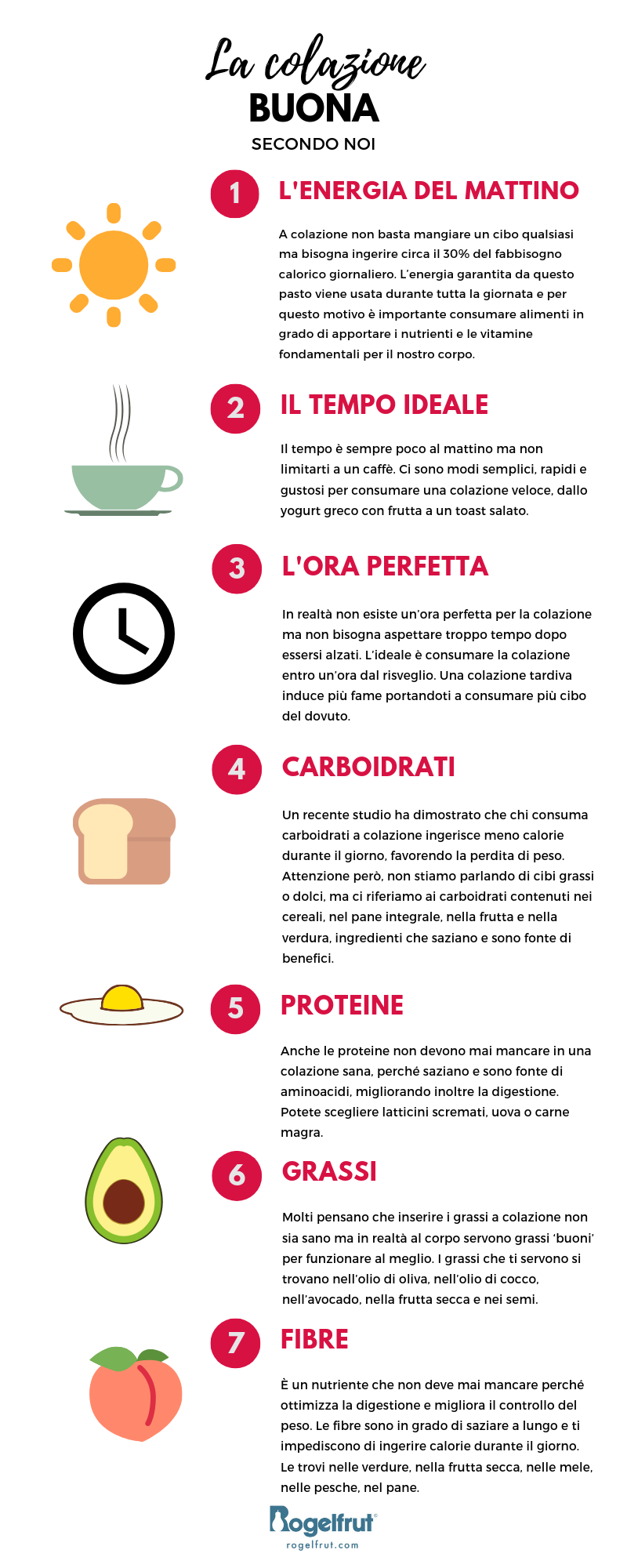 In realtà puoi scegliere gli alimenti della tua colazione in base alle tue preferenze e alla tua routine quotidiana. Ti segnaliamo però, come regola generale, alcuni alimenti che dovresti cercare di inserire nella tua colazione: