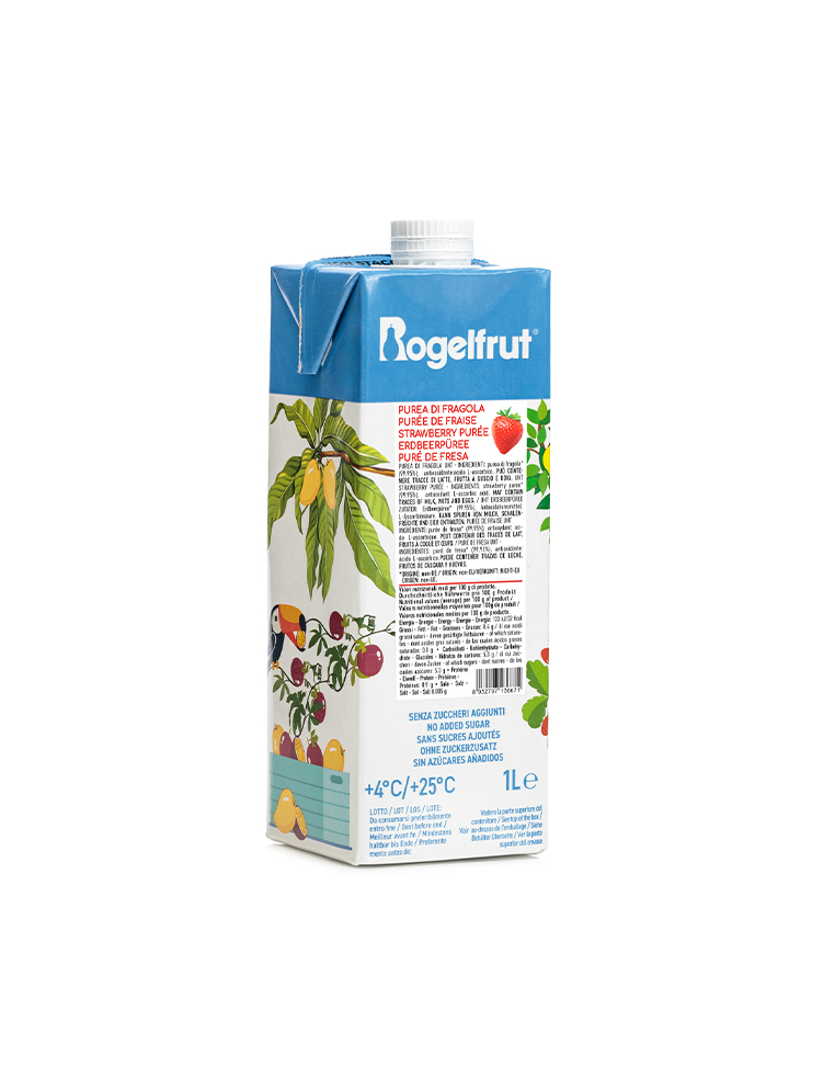 Nasce la prima gamma di puree a temperatura ambiente senza zuccheri aggiunti prodotta in Italia, studiata e prodotta da Rogelfrut. La purea di fragola viene lavorata dal fresco, attraverso un processo innovativo che permette al prodotto di essere conservato a temperatura ambiente. Il prodotto non contiene zuccheri aggiunti.